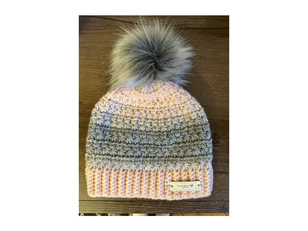 Růžovo šedá čepice s bambulí pro dámy , na obvod hlavy 52-56cm. Materiál jsem použila Nepál ombré s podílem vlny 20%. Čepice má krásnou bambuli, ladící k barvě kulicha .