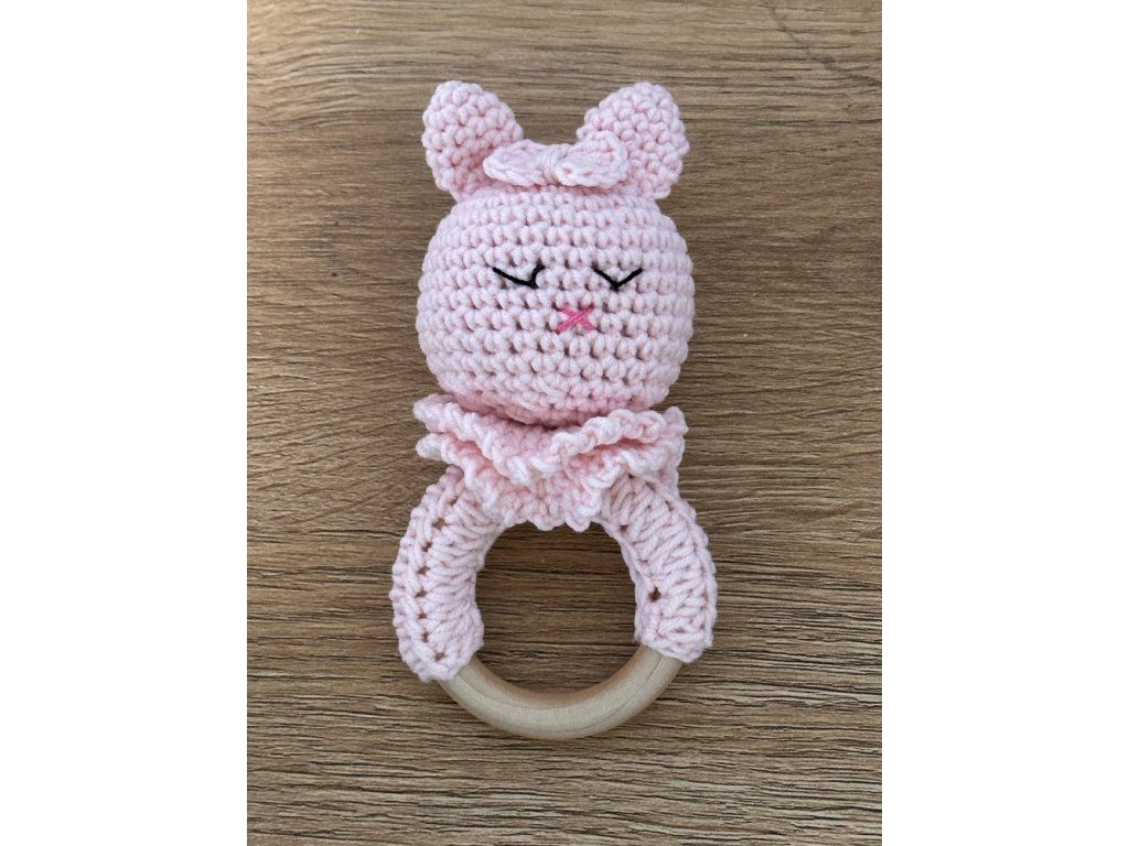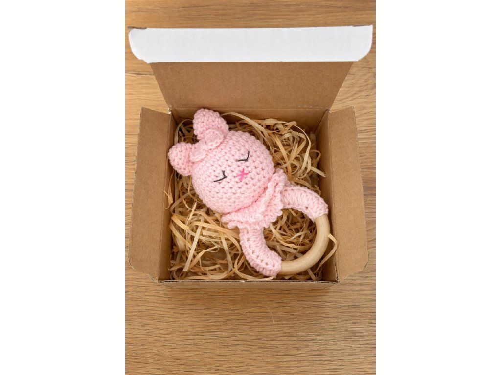Jemná handmade hračka pro miminko, která nejen krásně vypadá, ale i zabaví – uvnitř hlavičky se ukrývá chrastítko a dřevěný kroužek je ideální pro malé ručičky ✨