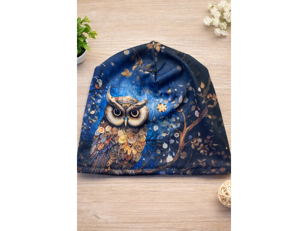 Stylová dámská čepice vhodná na jaro a podzim, která zaujme svým originálním motivem kouzelné sovy v noční přírodě. Barevný potisk v odstínech modré, zlaté a hnědé vytváří velmi efektní a elegantní vzhled. Čepice je pohodlná, lehká a příjemná na nošení.