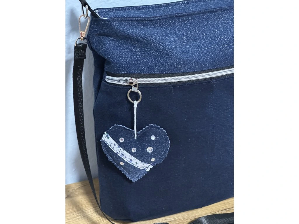 Uvnitř je bavlněná podšívka s volnou kapsou na drobnosti. Na přední straně najdete kapsu na zip ozdobenou srdíčkem. Kabelka se uzavírá na zip a má nastavitelný popruh, takže ji můžete nosit přes rameno nebo křížem přes tělo.