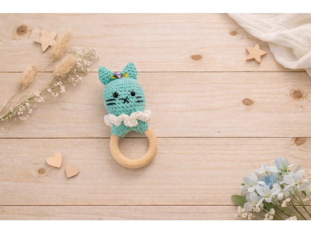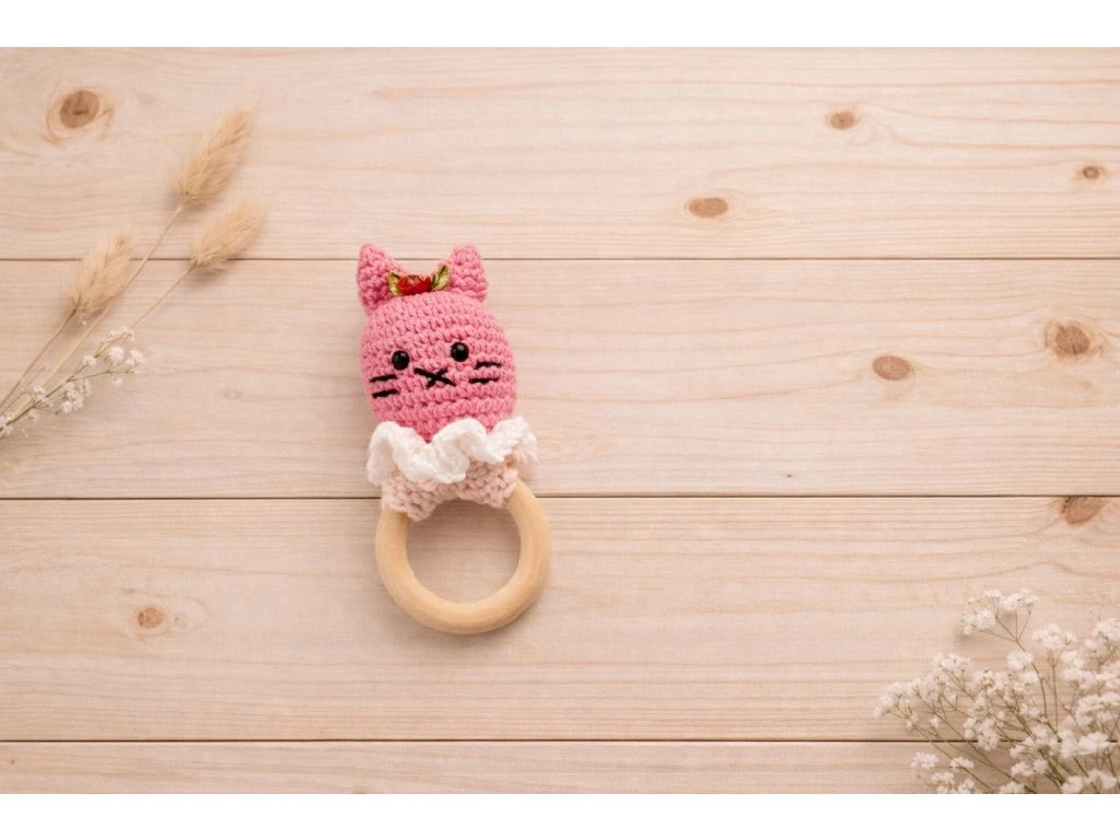 Roztomilé háčkované chrastítko ve tvaru milé kočičky, které potěší každé miminko. Kočička je ručně háčkovaná a vyplněná antialergenním dutým vláknem. Je připevněná k přírodnímu dřevěnému kroužku, který je příjemný do malých dětských ručiček.