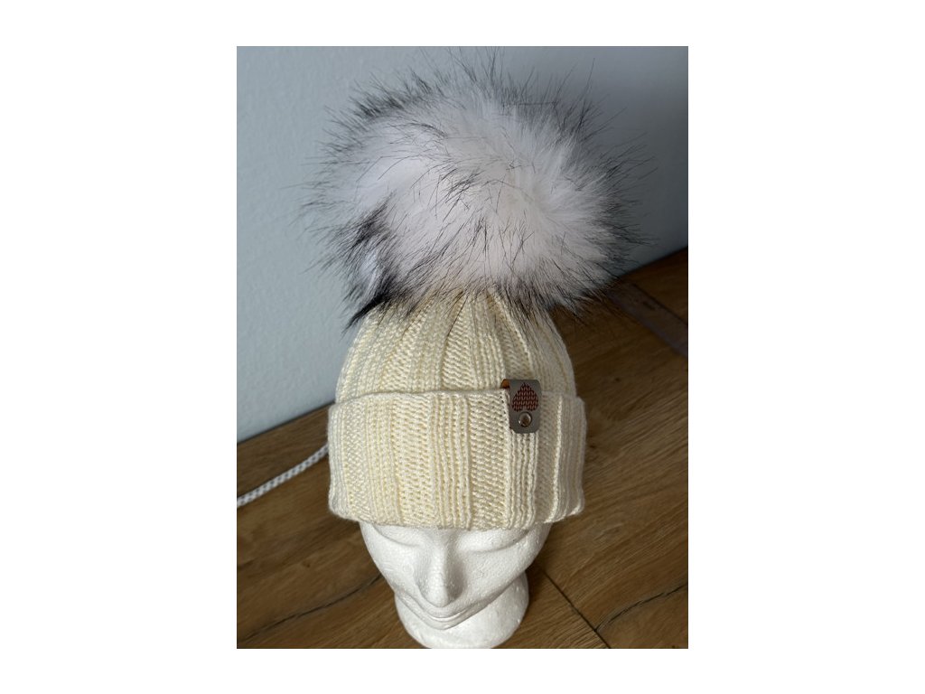 Krémová čepice s chlupatou bambulí velikou