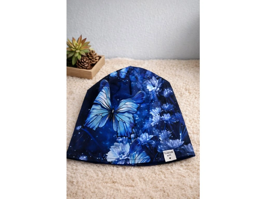 Originální čepice s výrazným motivem modrého motýla a květin, která zaujme na první pohled. Příjemný a pružný úplet zajistí pohodlí po celý den.