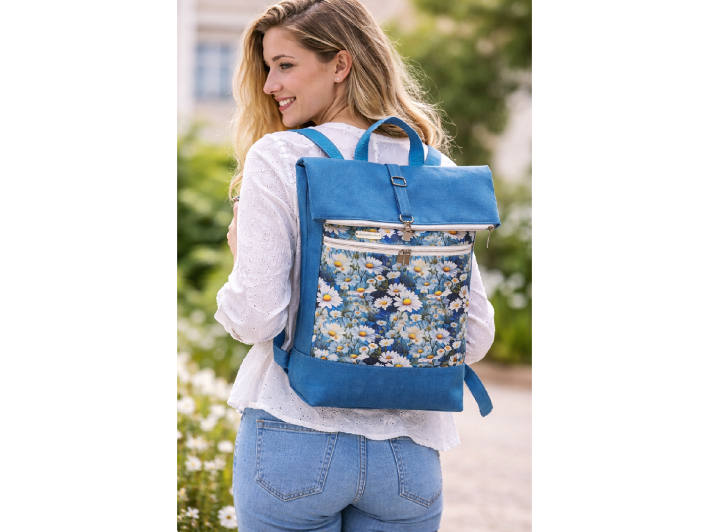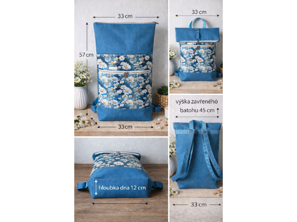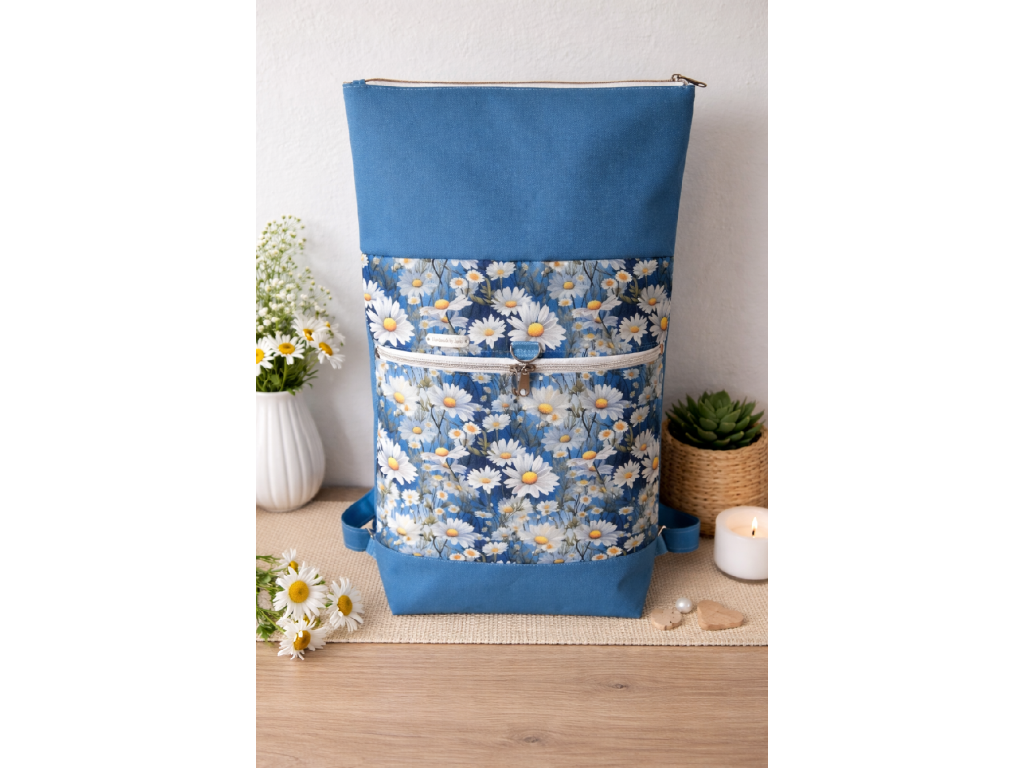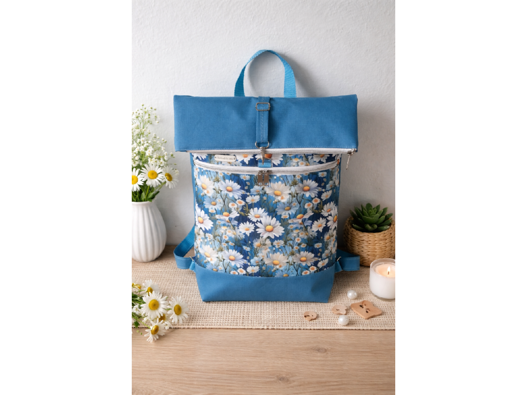 🎒 Modrý batoh s kopretinami – svěží styl a praktičnost v jednom