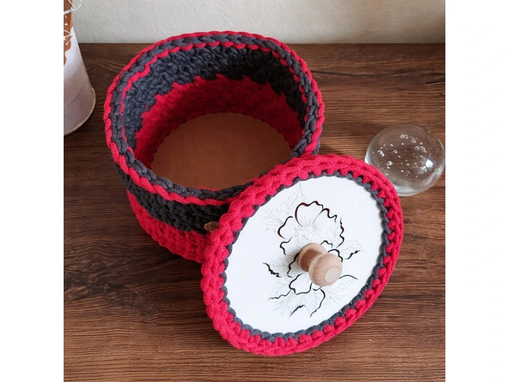 Ručně háčkovaný košík s dřevěným dnem a ozdobným víkem