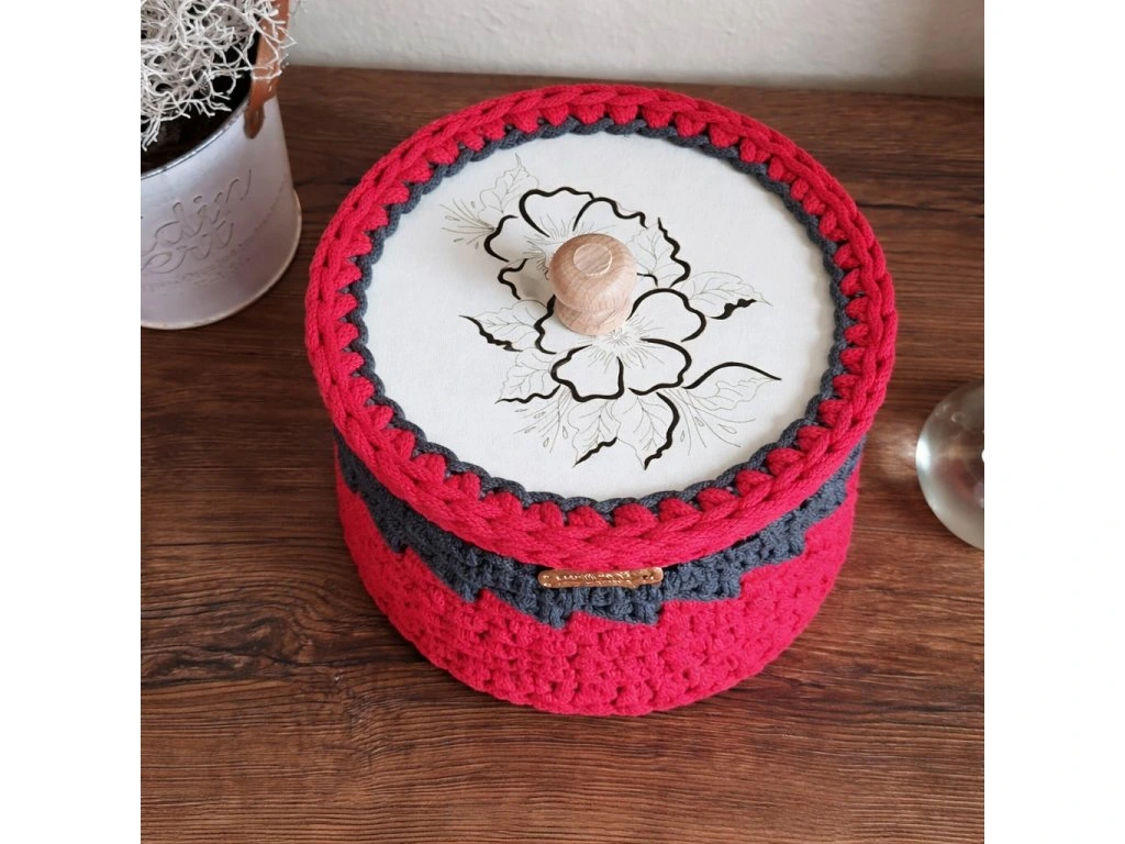 Dominantou košíku je ozdobné víko s jemným květinovým motivem a dřevěným úchytem, díky kterému se víko snadno otevírá. Víko je po obvodu dekorativně obháčkované, což dodává celému výrobku jedinečný ruční charakter.