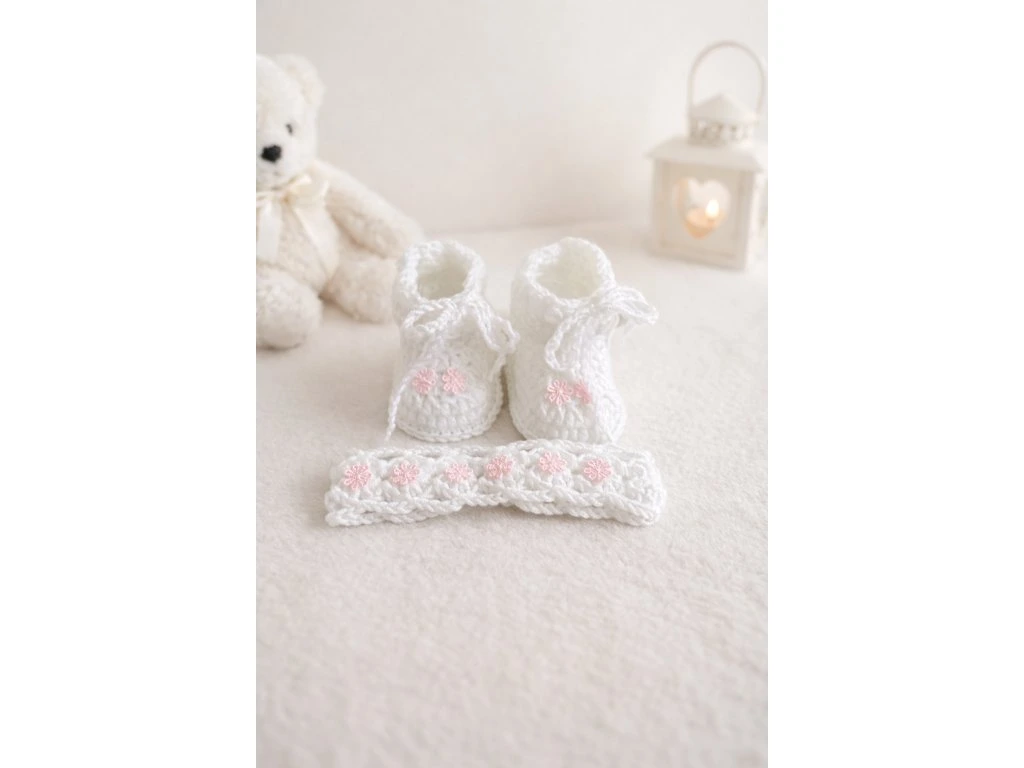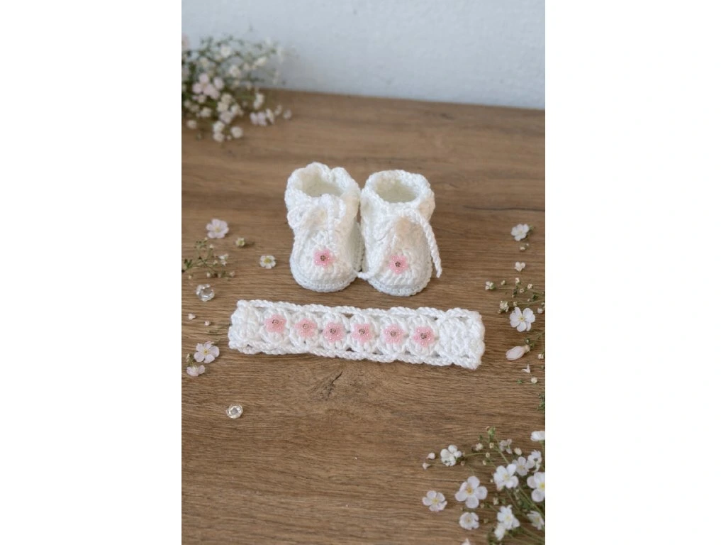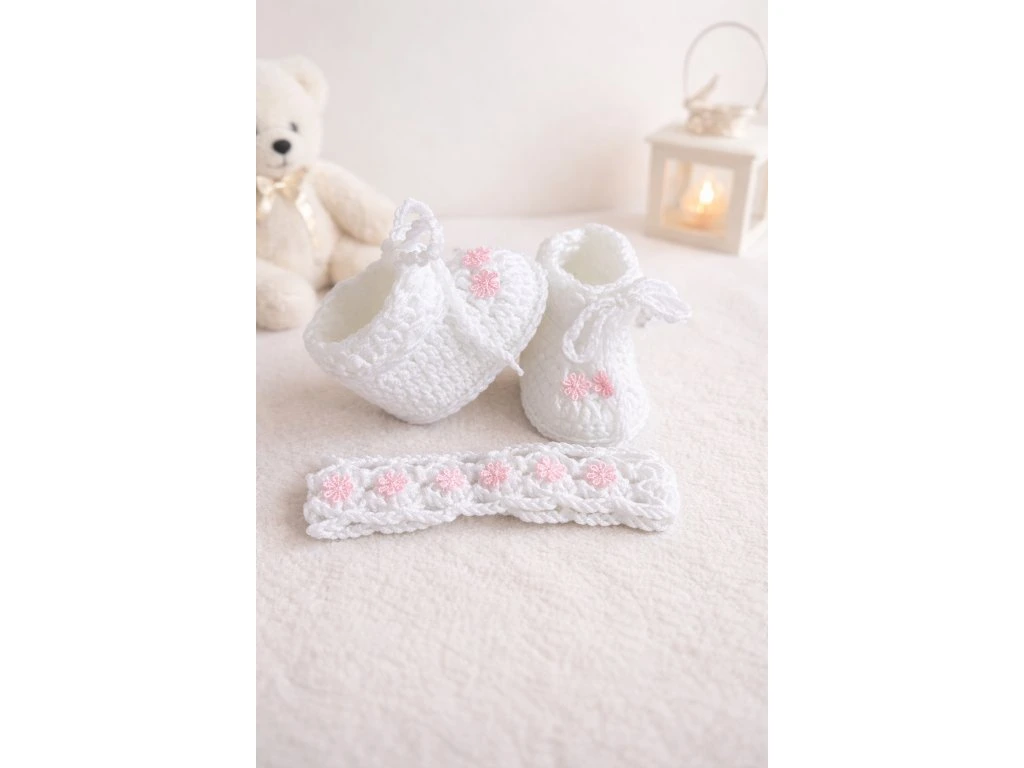 Dárkový set pro miminko obsahuje jemné capáčky a čelenku, které spolu krásně ladí a tvoří roztomilý a praktický celek.