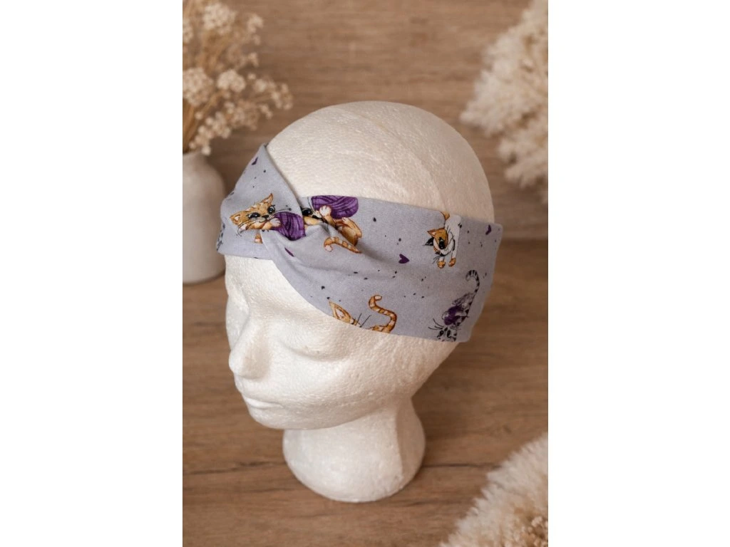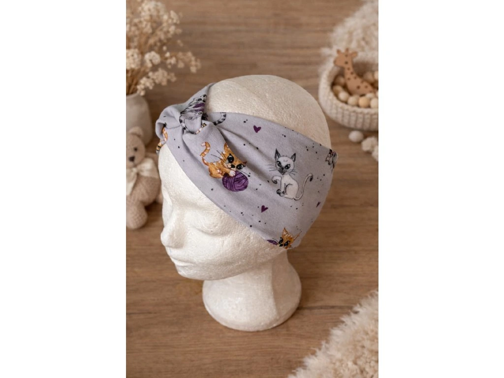Stylová dětská čelenka z příjemného bavlněného úpletu s roztomilým motivem kočiček. Díky pružnému materiálu se pohodlně přizpůsobí hlavě a dobře drží na místě. Uprostřed je ozdobný uzel, který dodává čelence moderní vzhled.