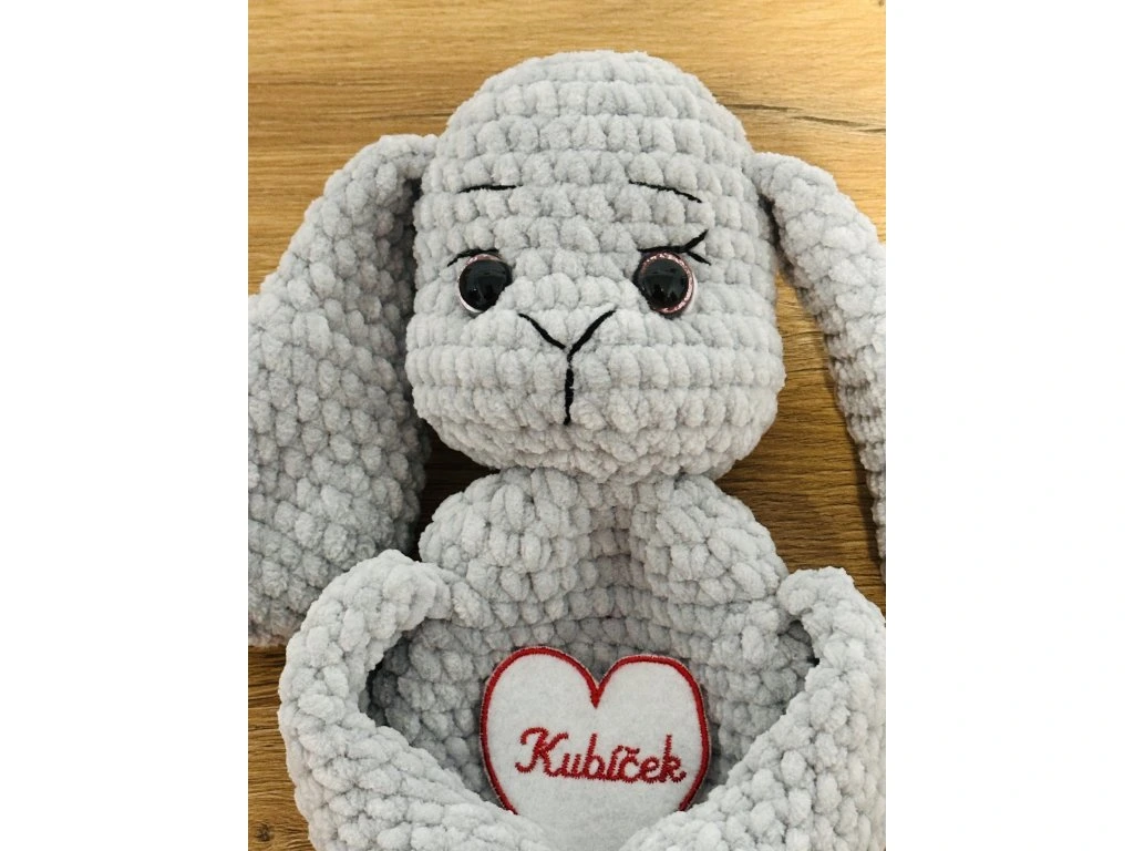 Na bříšku má přišité srdíčko se jménem, které lze vyrobit na přání – v barvě i se jménem podle vašeho výběru, takže vznikne krásný osobní dárek.